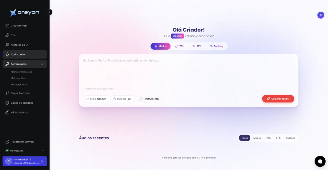 Sem truque. Você leva R$ 180 só em curso. Ganha 800 créditos. Acesso a todas as ferramentas e suporte ao vivo. O preço é baixo de propósito — a Orayon lucra quando você decide ir além, comprando mais créditos, cursos avulsos ou evoluindo pra um plano maior. No seu tempo. Ninguém te empurra nada.
